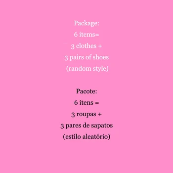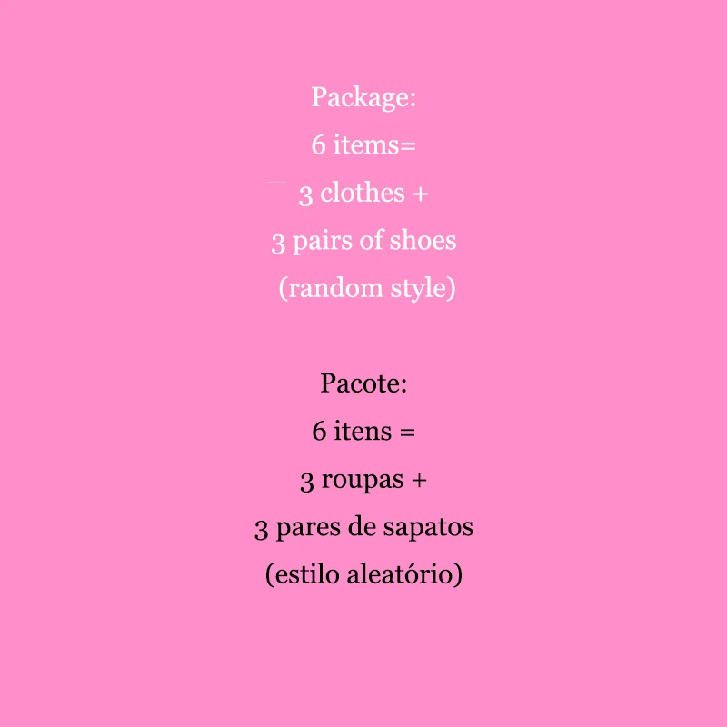 Package: 6 items= 3 clothes + 3 pairs of shoes (random style)