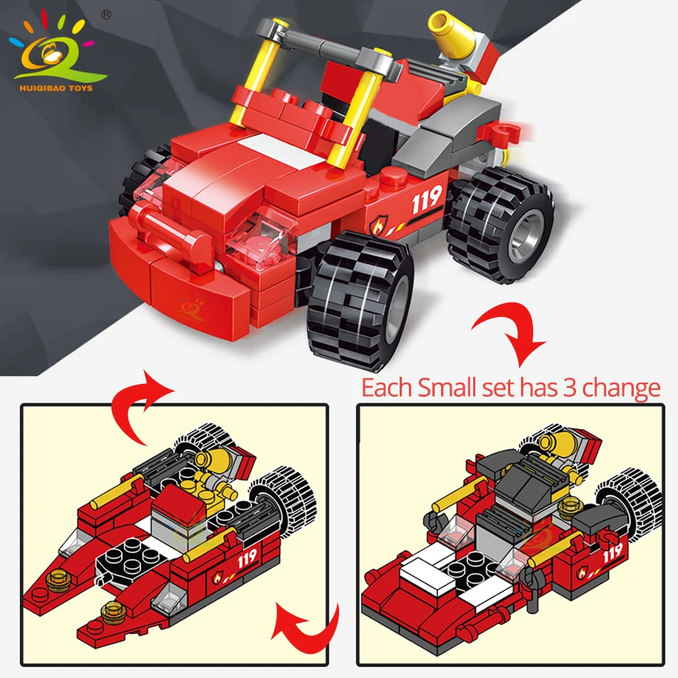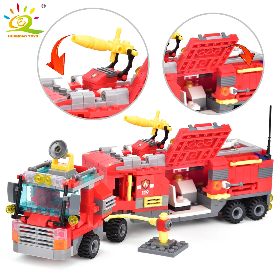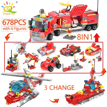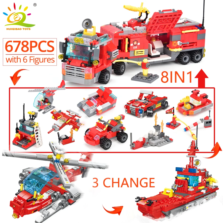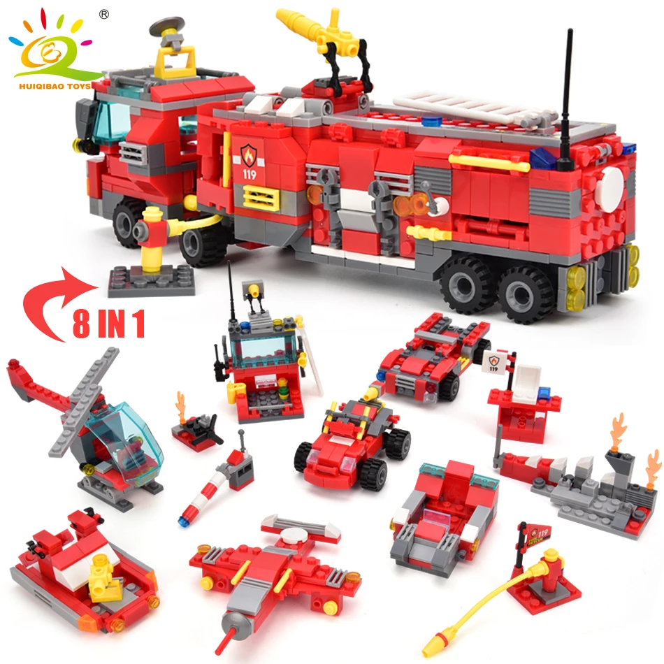 HUIQIBAO 678pcs 8in1 City Fire Truck Model Building Blocks Firefighting Set Fireman Figures Bricks Construction Toy for Children